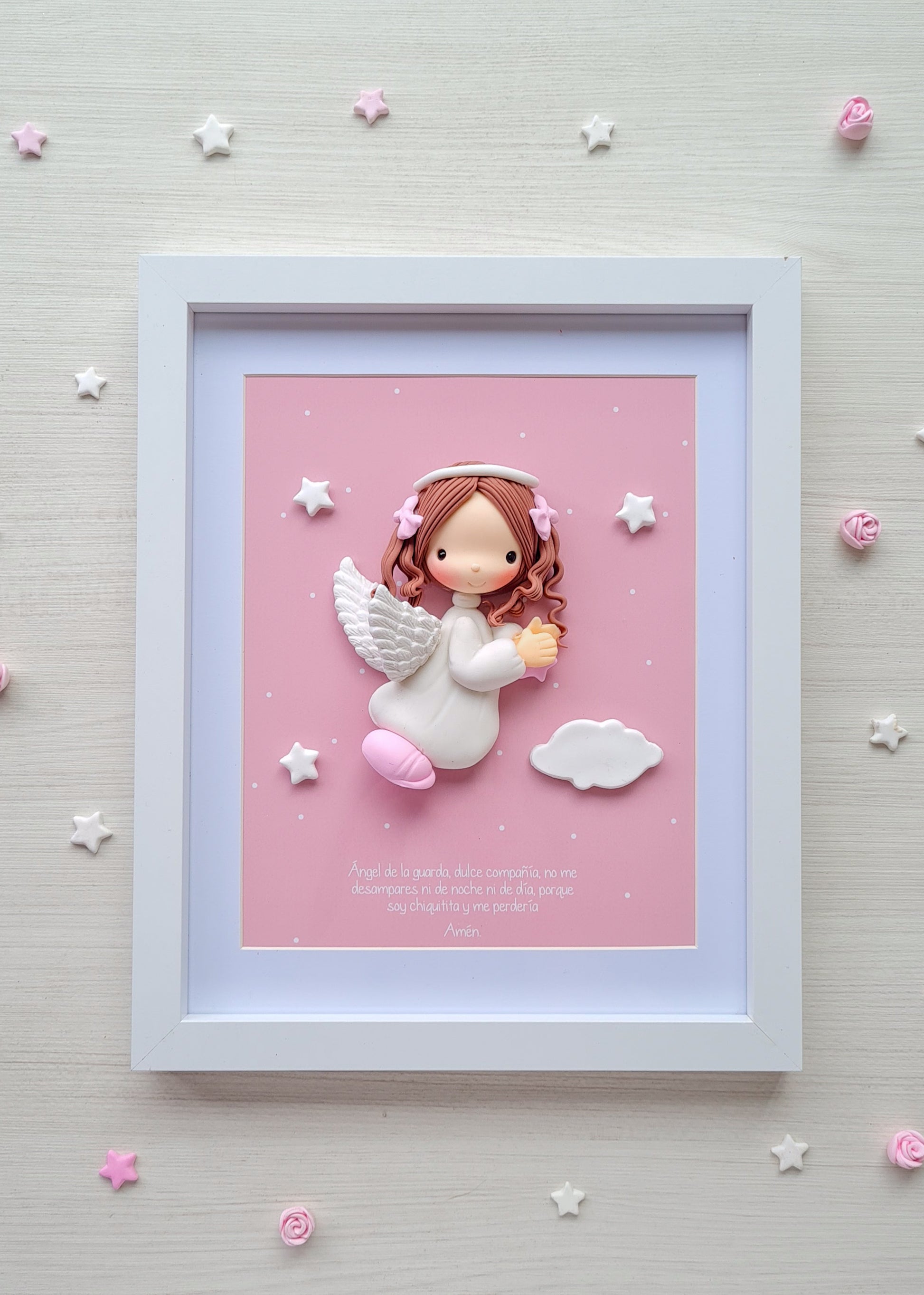 Cuadro Ángel de la Guarda Niña hecho a mano en porcelana fría, creado para llenar de ternura y protección la habitación de tu pequeña.